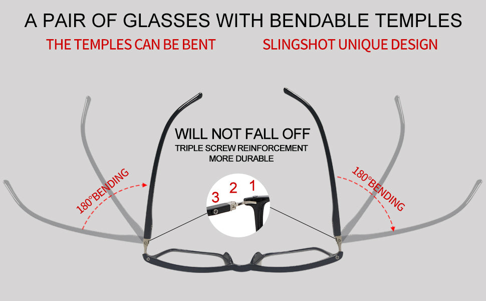 - FLEXIBLE & DURABLE: Flexible - The metal Spring hinge can be opend 180° smoothly - will not pinch your face. Triple-protected - More secure - The eyewear frame and temples are reinforced with three stainless steel screws, which also add a fashion design to the optical frame for men. High quality - With 27,359 tests, the readers has a service life of up to 4 years.
