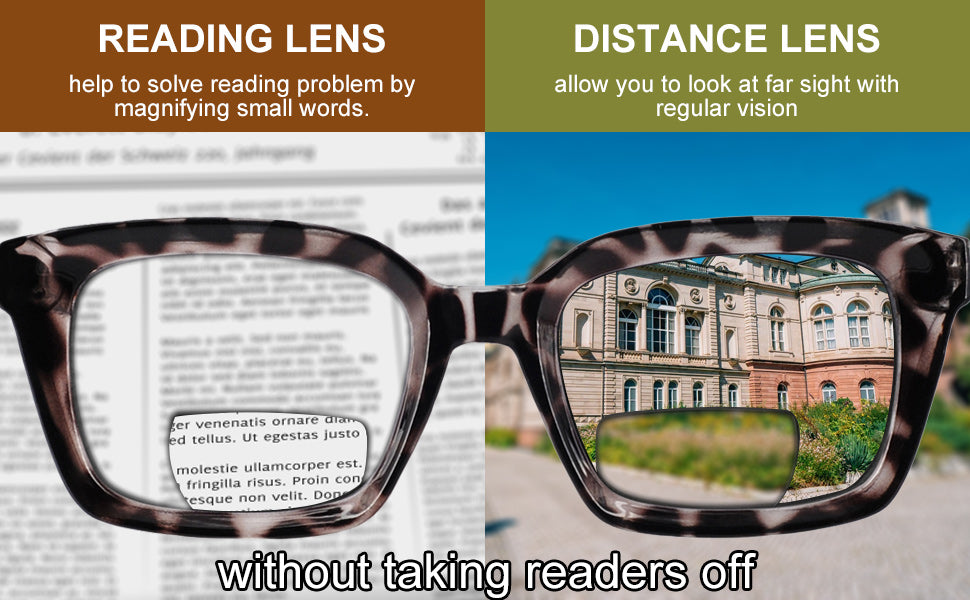 - Bifocal sunglasses women 2.0 : Fashion reading sunglasses with bifocal readers has clear vision by distance and reading area. Distance lens help to look far away with normal sunglasses vision. Reading lens help to read and work by magnifying small print. Without taking it off is so perfect for outdoor reading, driving, fishing, traveling, shopping, walking and other outdoor activities.